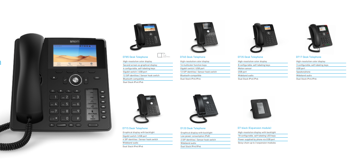 alt="Global 700 Series" The professional 700 Series Blackline telephones are aestheti - cally appealing, offering a highly practical industrial design to meet mission critical business requirements where the telephone is a key tool in every day work. These high performance devices provide the best in wideband HD audio, ensuring crystal clear sound quality, Bluetooth-compatibility, high definition displays, color screens, support for programmable keys to ensure a continual overview of numerous extensions, a preinstalled certificate to enable secure provisioning without manual inter - vention, robust CTI integration to support security standards such as TLS and SRTP. The series meets all business budgetary requirements in five models from the entry level up to the executive office.
