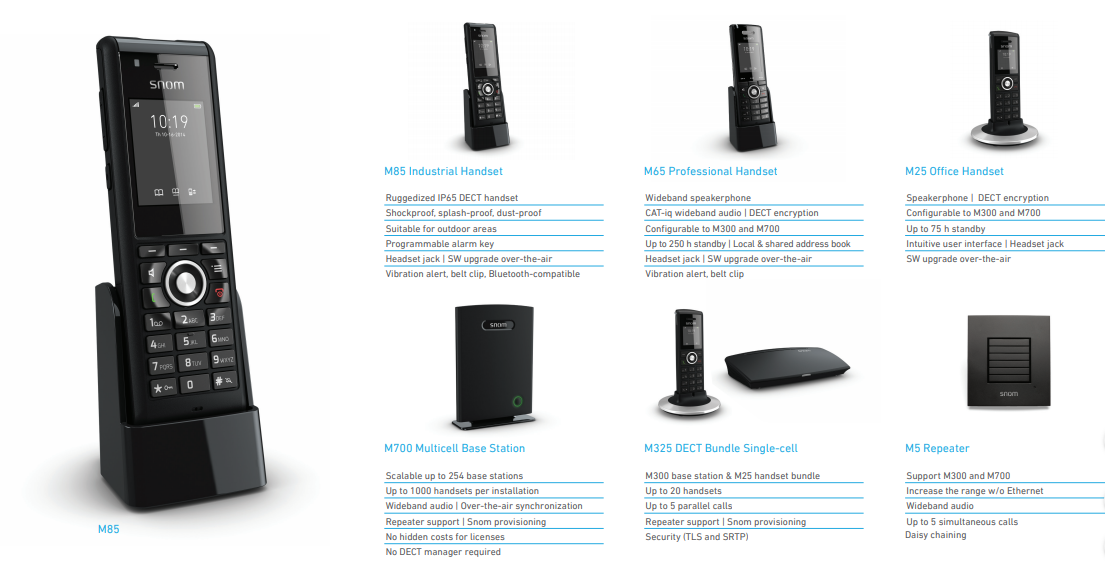 Whether using a single radio base station or a multicell installation, Snom DECT solution allows you to keep doing business when moving around the workplace.The Snom family of IP DECT systems and handsets ensure that business users do not sacrifice functionality and quality for workplace mobility while maintaining the capability of their desk telephones. Whether in small business environments,large enterprises, factories, warehouses, campuses, tempo - rary construction sites, schools, mission critical environments, or healthcare centers, the Snom IP-DECT systems can be in - stalled rapidly and scaled instantly while providing superb HD digital voice communications with call security and encryption and maintaining all of the advanced features of the business telephone system.